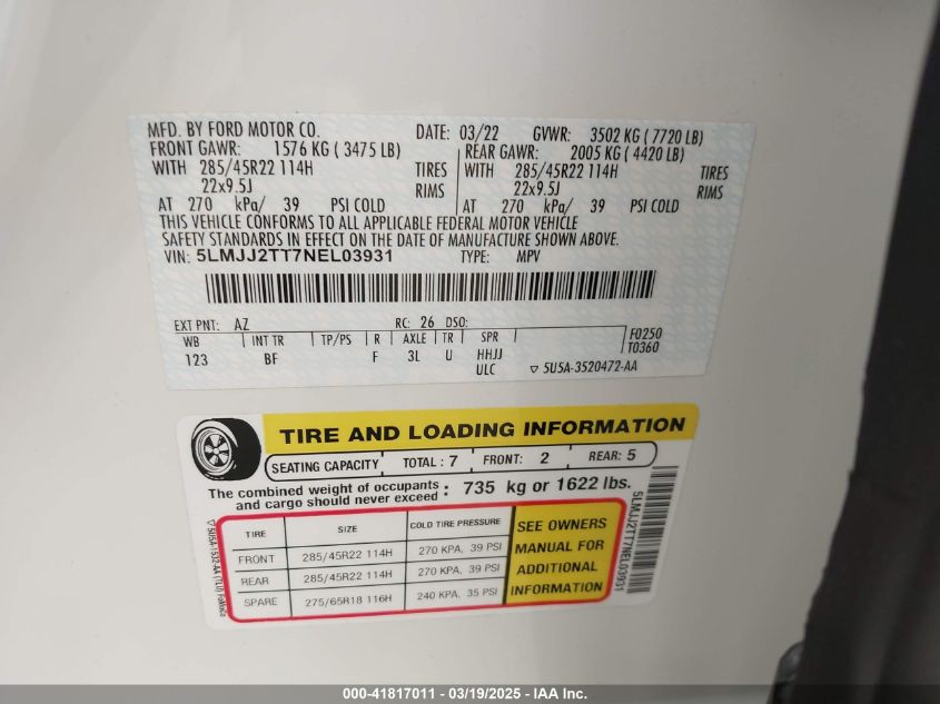 Color WhiteCylinders 6Drive Full driveVIN 5LMJJ2TT7NE******State Run & Drive VerifiedDamage Front left