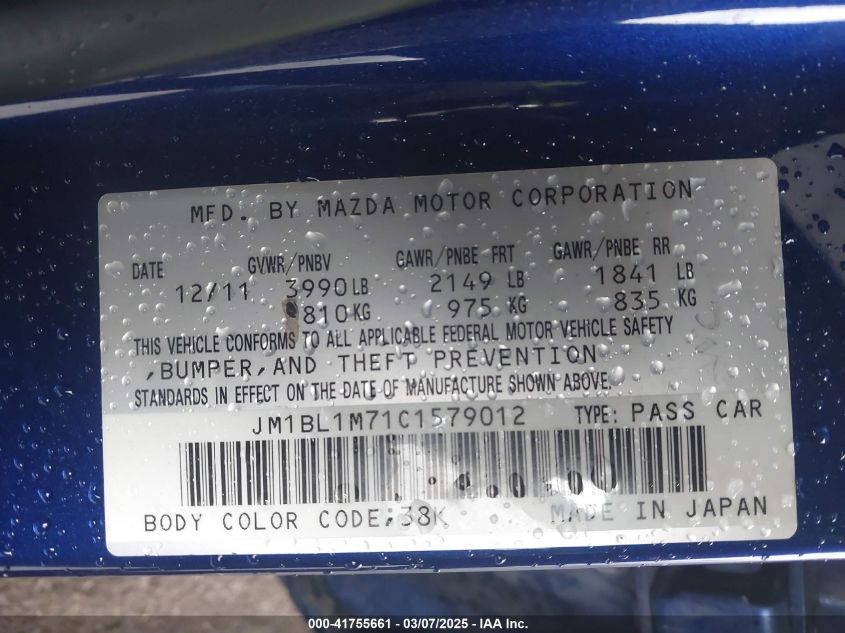 Color BlueCylinders 4Drive Front wheel driveVIN JM1BL1M71C1******State Run & Drive VerifiedDamage Right sideAuction date 2025-04-01 AutoRIA