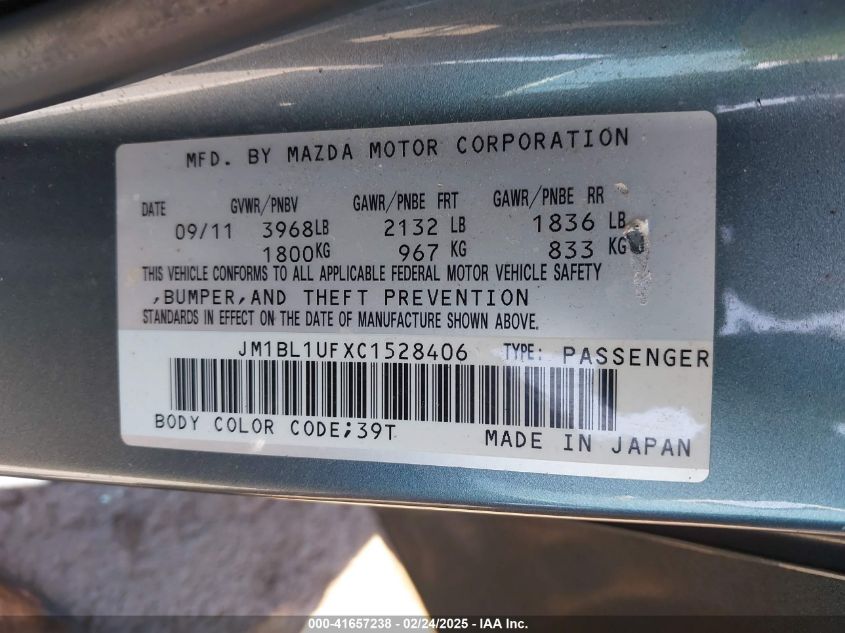 Color GrayCylinders 4Drive Front wheel driveVIN JM1BL1UFXC1******State Run & Drive VerifiedDamage Right side AutoRIA