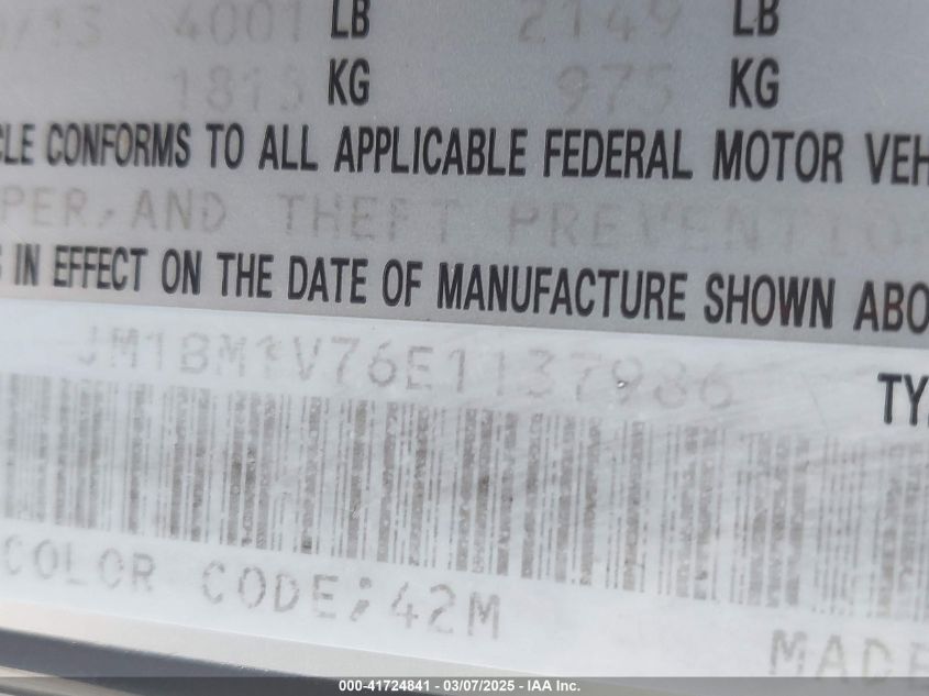 Color BlueCylinders 4Drive Front wheel driveVIN JM1BM1V76E1******State Run & Drive VerifiedDamage Front or backAuction date 2025-03-25 AutoRIA