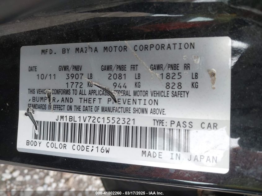 Color BlackCylinders 4Drive Front wheel driveVIN JM1BL1V72C1******State Run & Drive VerifiedDamage Front left AutoRIA