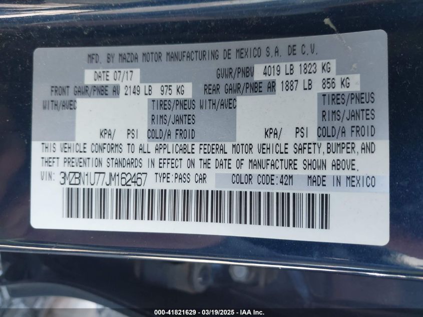 Color BlueCylinders 4Drive Front wheel driveVIN 3MZBN1U77JM******State Run & Drive VerifiedDamage Roof AutoRIA