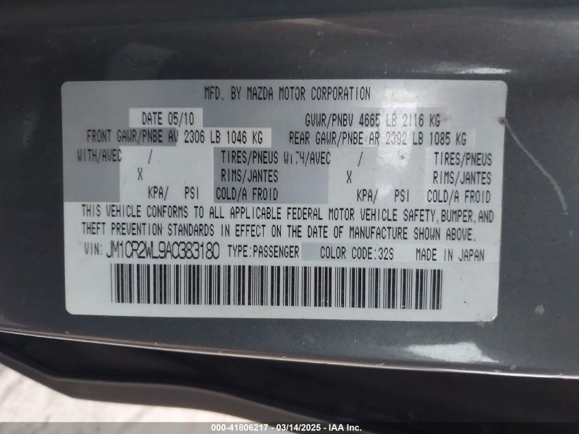 Color GrayCylinders 4Drive Front wheel driveVIN JM1CR2WL9A0******State Run & Drive VerifiedDamage Left sideAuction date 2025-03-25 AutoRIA