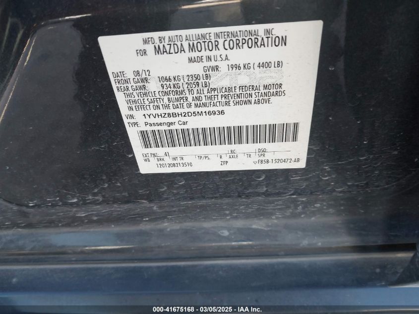 Color TinCylinders 4Drive Front wheel driveVIN 1YVHZ8BH2D5******State Run & Drive VerifiedDamage Vandalism AutoRIA