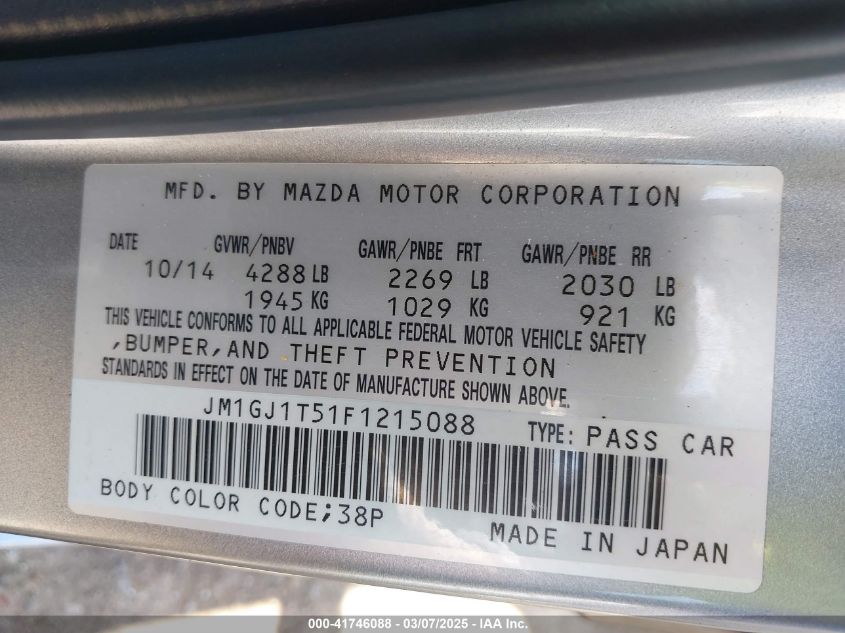 2015 MAZDA 6 2015 Gasoline, 2.5, Front wheel drive, VIN - JM1GJ1T51F1****** from the USA