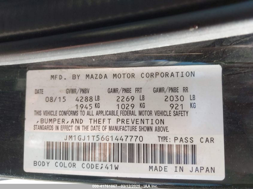 2016 MAZDA 6 2016 Gasoline, 2.5, Front wheel drive, VIN - JM1GJ1T56G1****** from the USA