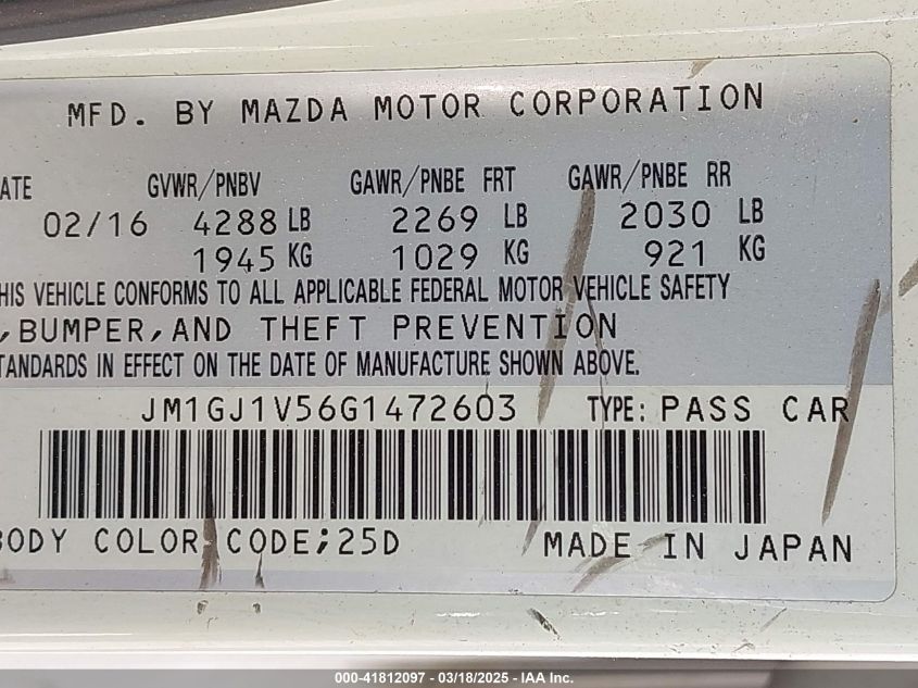 2016 MAZDA 6 2016 Gasoline, 2.5, Front wheel drive, VIN - JM1GJ1V56G1****** from the USA