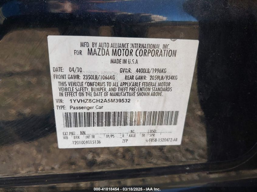 2010 MAZDA 6 2010 Gasoline, 2.5, Front wheel drive, VIN - 1YVHZ8CH2A5****** from the USA