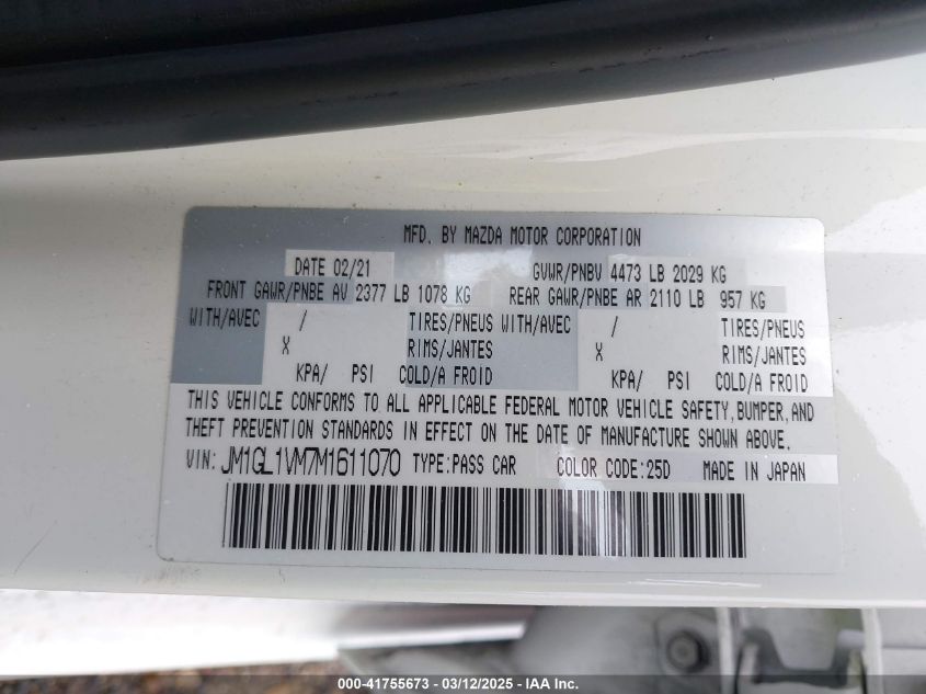 Color WhiteCylinders 4Drive Front wheel driveVIN JM1GL1VM7M1******State Run & Drive VerifiedDamage Front and backAuction date 2025-03-24 AutoRIA
