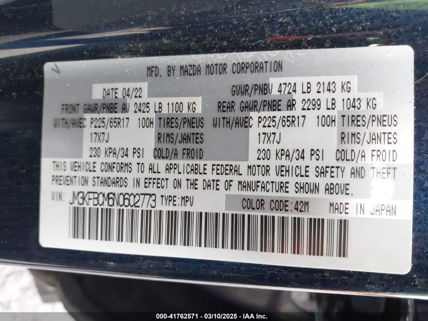 Color BlueCylinders 4Drive Full driveVIN JM3KFBCM6N0******State Run & Drive VerifiedDamage Front or back AutoRIA