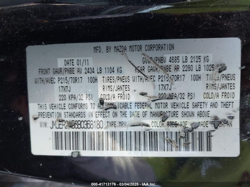 Color BlackCylinders 4Drive Front wheel driveVIN JM3ER2A58B0******State Run & Drive VerifiedDamage Front or backAuction date 2025-03-26 AutoRIA