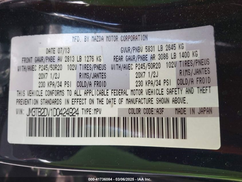 Color BlackCylinders 6Drive Front wheel driveVIN JM3TB2DV1D0******State Run & Drive VerifiedDamage Front leftAuction date 2025-03-25 AutoRIA