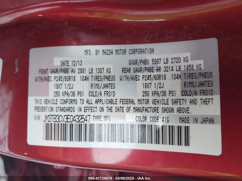Color RedCylinders 6Drive Full driveVIN JM3TB3CV3E0******State Run & Drive VerifiedDamage Front or backAuction date 2025-03-25 AutoRIA