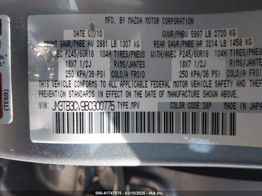 Color SilverCylinders 6Drive Full driveVIN JM3TB3CV9B0******State Run & Drive VerifiedDamage Front rightAuction date 2025-03-25 AutoRIA