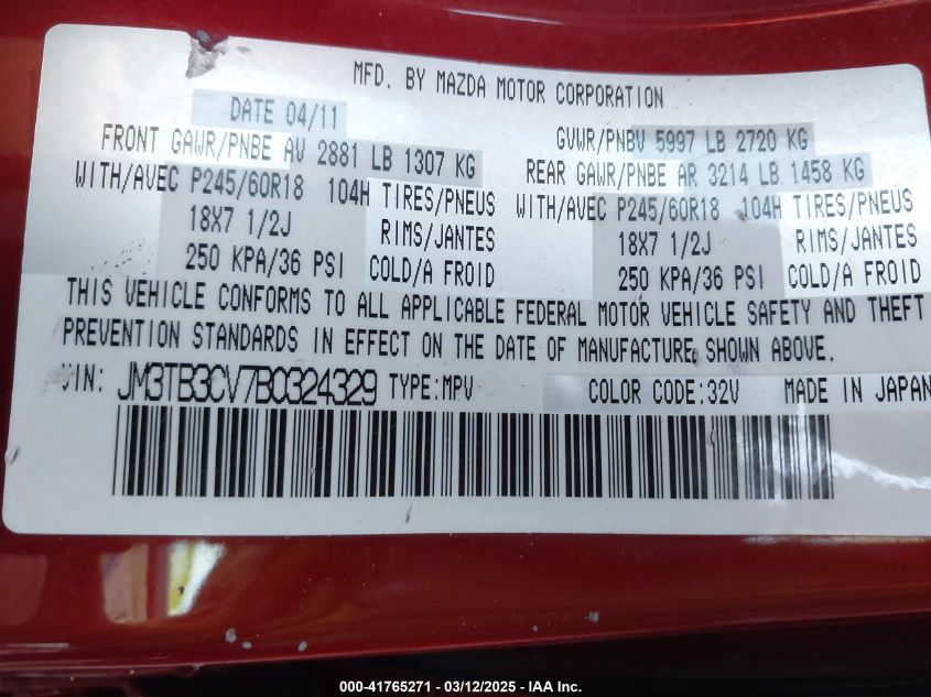 Color BurgundyCylinders 6Drive Full driveVIN JM3TB3CV7B0******State Run & Drive VerifiedDamage Front or backAuction date 2025-03-26 AutoRIA