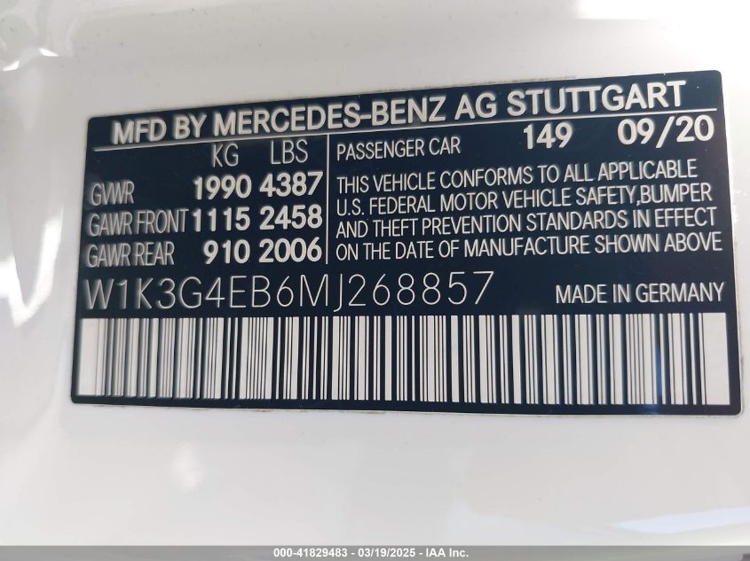 Color WhiteCylinders 4Drive Front wheel driveVIN W1K3G4EB6MJ******State Run & Drive VerifiedDamage Insignificant AutoRIA