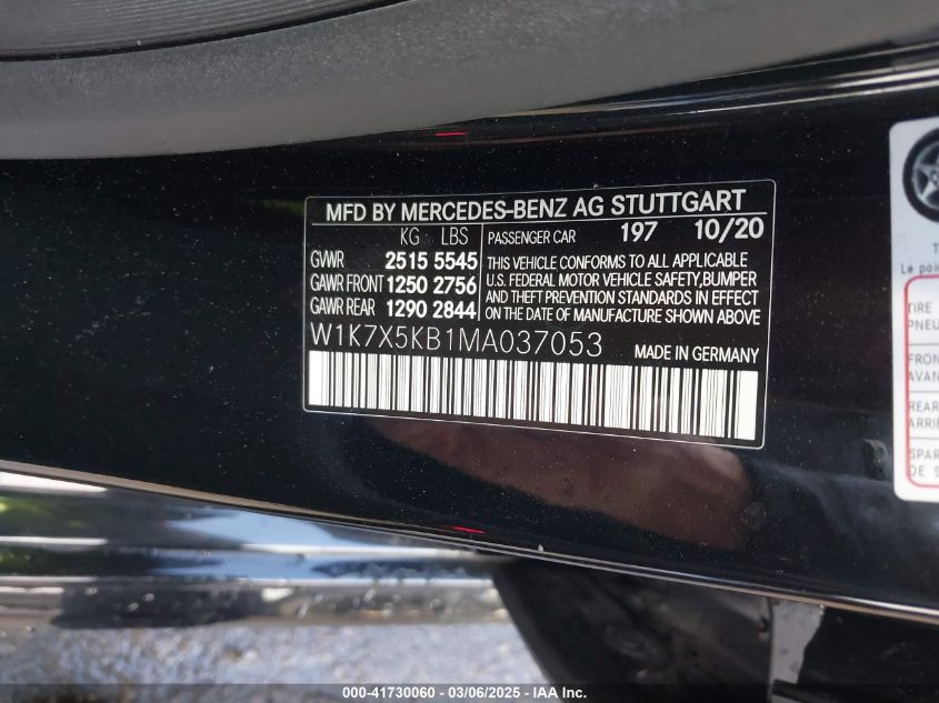 Color BlackCylinders 6Drive Full driveVIN W1K7X5KB1MA******State Run & Drive VerifiedDamage Front right
