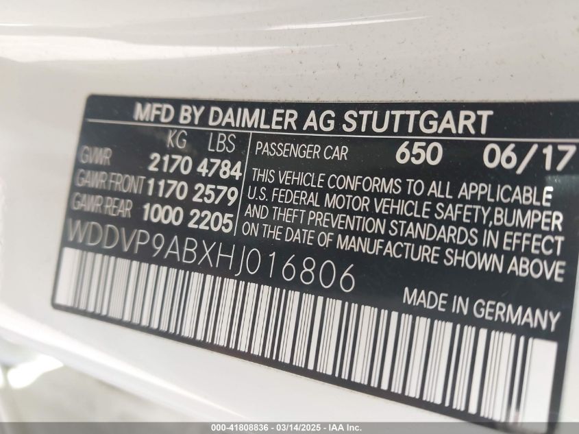 Color WhiteDrive Front wheel driveVIN WDDVP9ABXHJ******State Run & Drive VerifiedDamage It is unknownAuction date 2025-03-25 AutoRIA