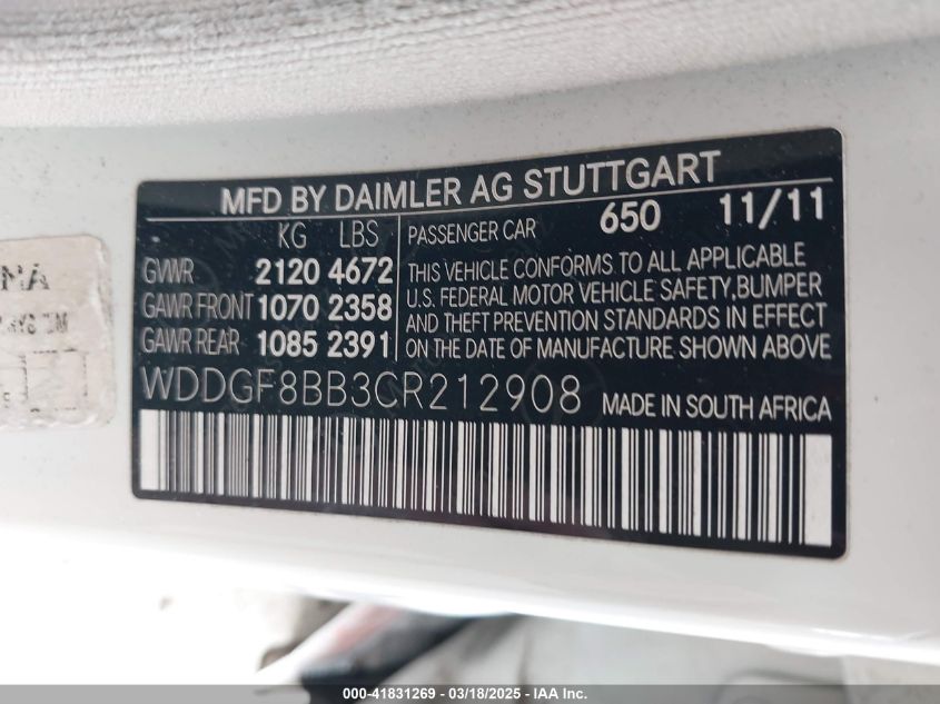 Color WhiteCylinders 6Drive Full driveVIN WDDGF8BB3CR******State Run & Drive VerifiedDamage Back AutoRIA
