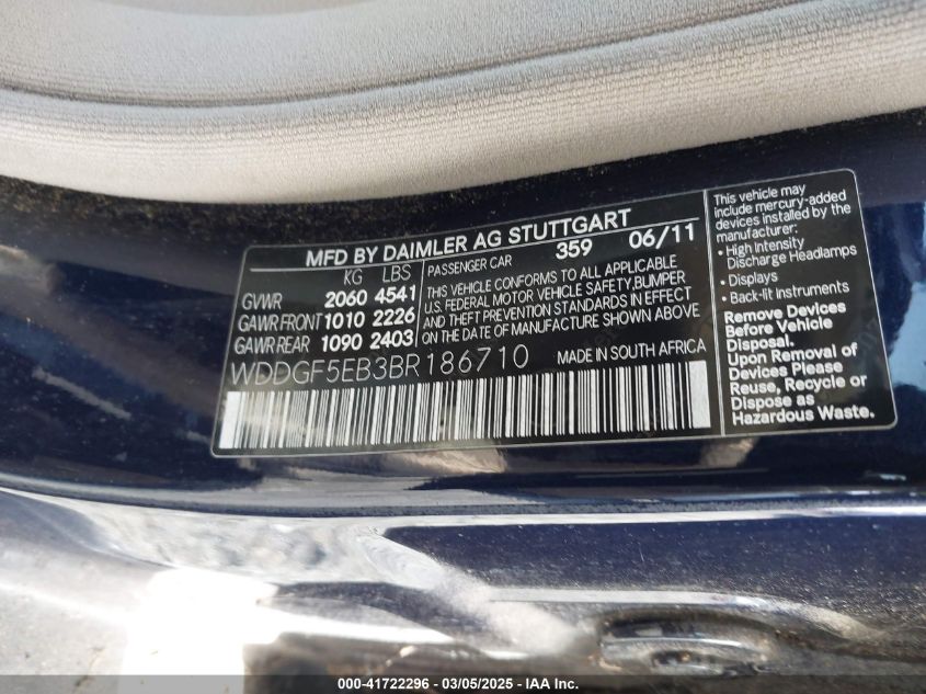 Color BlackCylinders 6Drive Rear wheel driveVIN WDDGF5EB3BR******State Run & Drive VerifiedDamage InsignificantAuction date 2025-03-20 AutoRIA