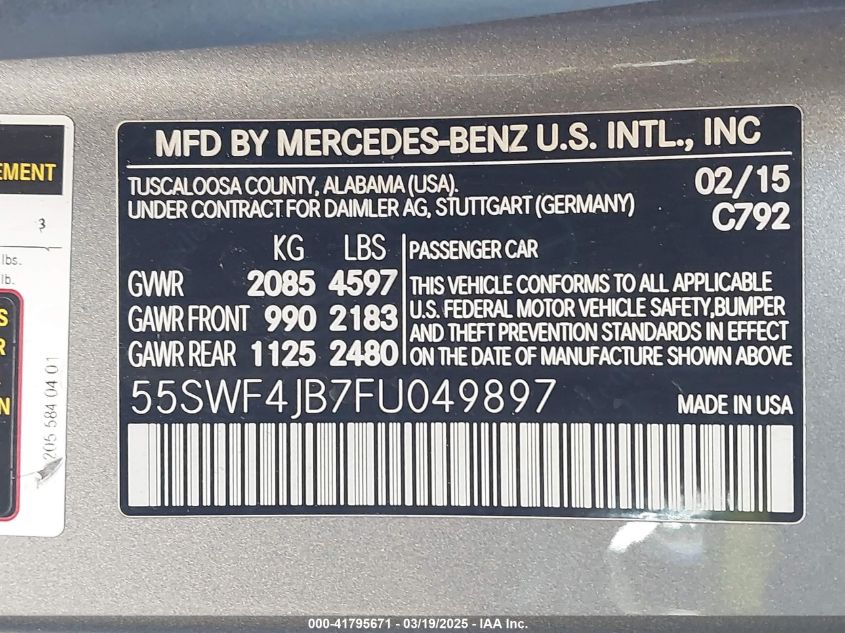 2015 MERCEDES-BENZ C-CLASS 2015 Gasoline, 2.0, Rear wheel drive, VIN - 55SWF4JB7FU****** from the USA