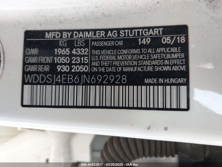 Color WhiteCylinders 4Drive Front wheel driveVIN WDDSJ4EB6JN******State Run & Drive VerifiedDamage Insignificant AutoRIA