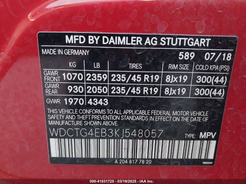 Color RedCylinders 4Drive Front wheel driveVIN WDCTG4EB3KJ******State Run & Drive VerifiedDamage From the sides AutoRIA