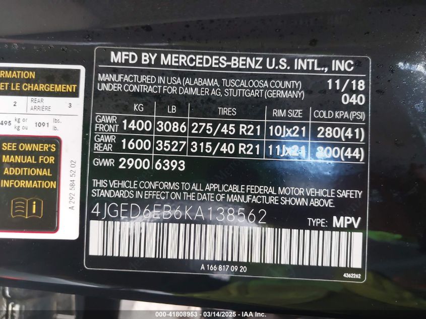 2019 MERCEDES-BENZ GLE-CLASS 2019 Gasoline, 3.0, Full drive, VIN - 4JGED6EB6KA****** from the USA