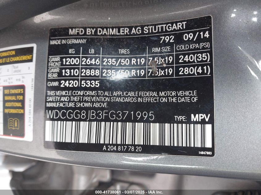 2015 MERCEDES-BENZ GLK-CLASS 2015 Gasoline, 3.5, Full drive, VIN - WDCGG8JB3FG****** from the USA