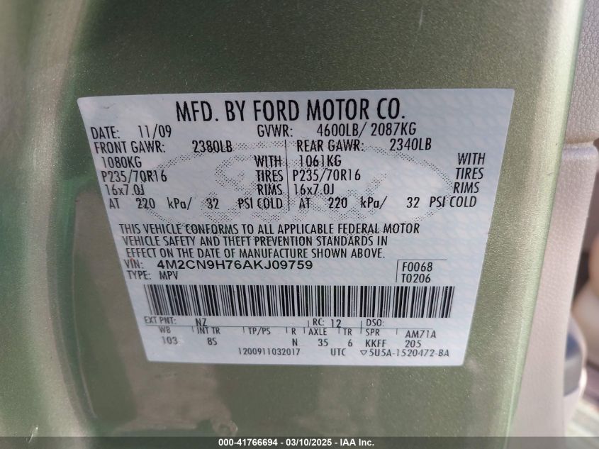 Color GreenCylinders 4Drive Full driveVIN 4M2CN9H76AK******State Run & Drive VerifiedDamage InsignificantAuction date 2025-03-20