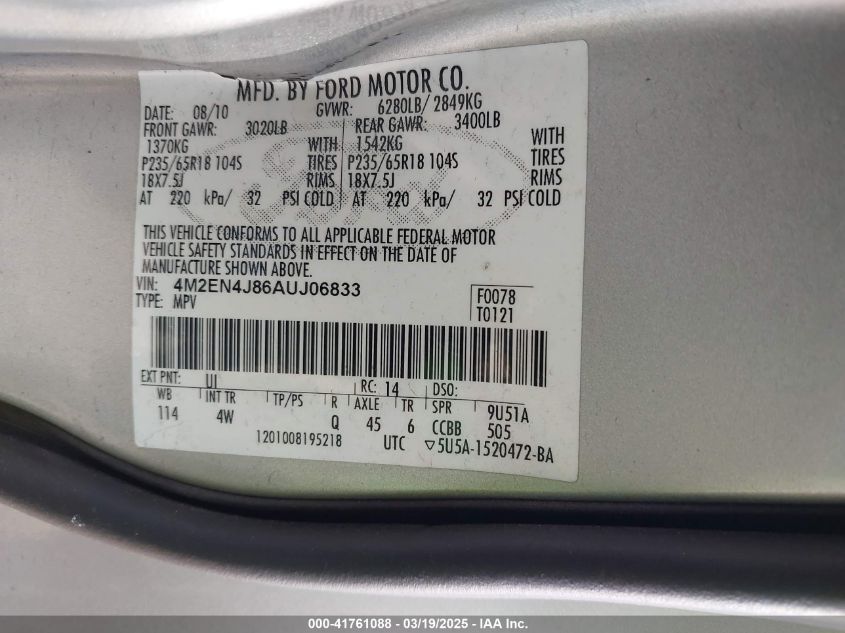 Color SilverCylinders 8Drive Full driveVIN 4M2EN4J86AU******State Run & Drive VerifiedDamage Front rightAuction date 2025-03-25