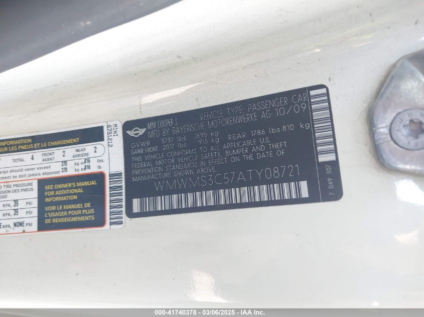 2010 MINI COOPER 2010 Gasoline, 1.6, Front wheel drive, VIN - WMWMS3C57AT****** from the USA