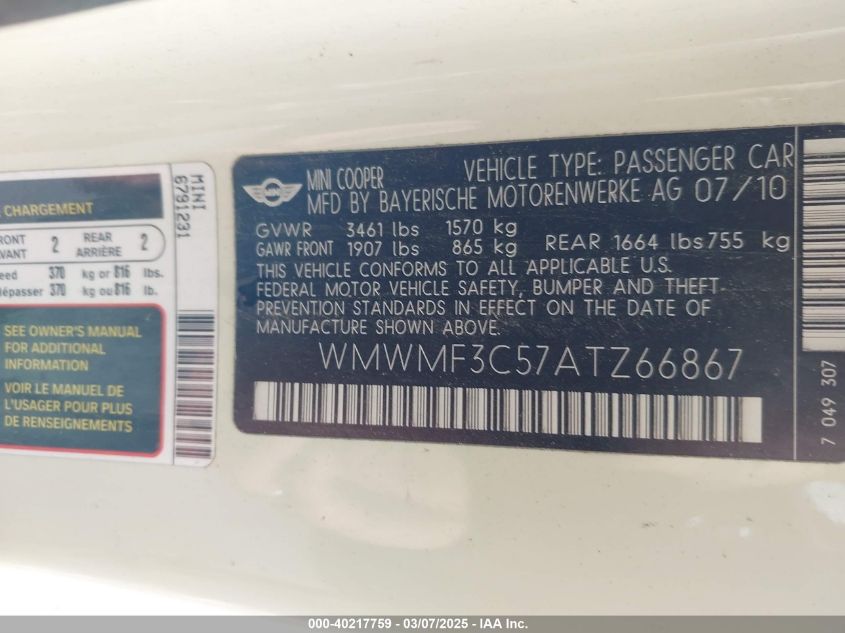 2010 MINI COOPER 2010 Gasoline, 1.6, Front wheel drive, VIN - WMWMF3C57AT****** from the USA