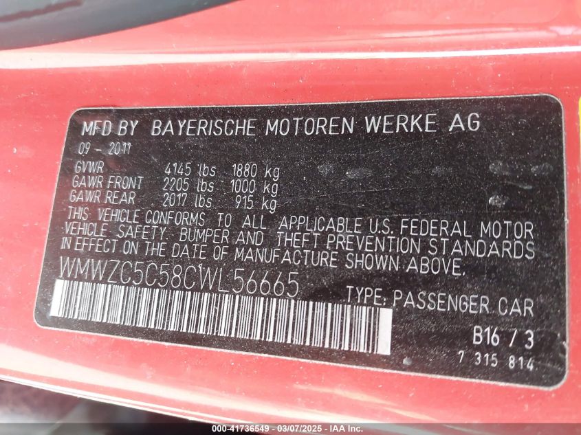 Color RedCylinders 4Drive Full driveVIN WMWZC5C58CW******State Run & Drive VerifiedDamage Right sideAuction date 2025-03-20 AutoRIA