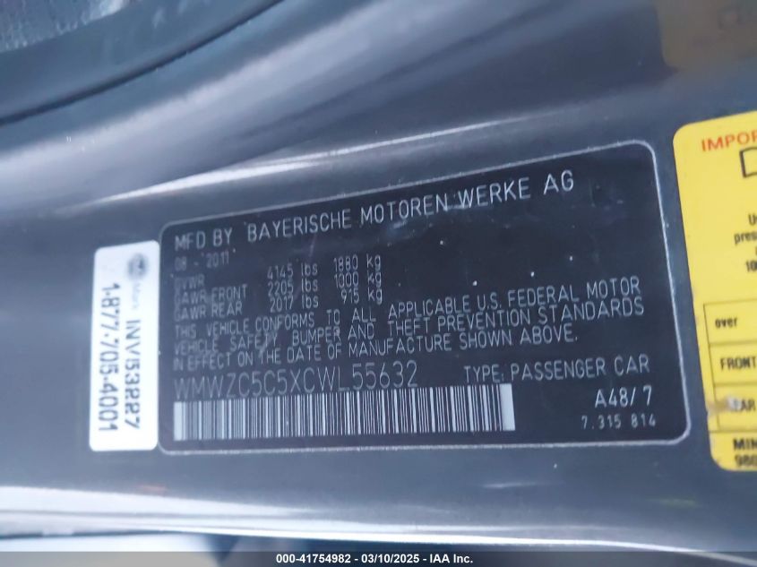 Color GrayCylinders 4Drive Full driveVIN WMWZC5C5XCW******State Run & Drive VerifiedDamage Front and backAuction date 2025-03-20 AutoRIA