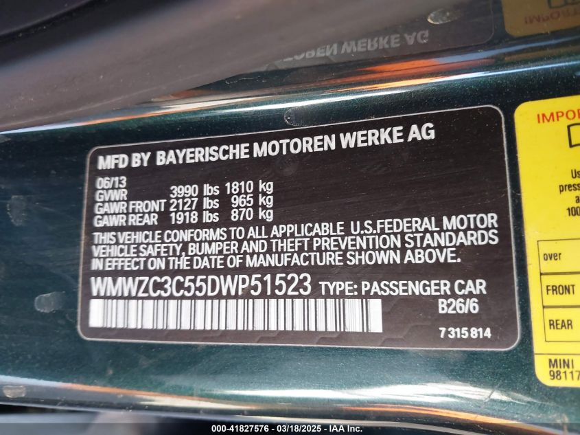 Color GreenCylinders 4Drive Front wheel driveVIN WMWZC3C55DW******State Run & Drive VerifiedDamage Front or back AutoRIA