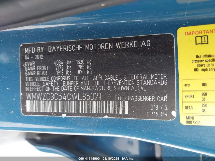 Color BlueCylinders 4Drive Front wheel driveVIN WMWZC3C54CW******State Run & Drive VerifiedDamage InsignificantAuction date 2025-03-26 AutoRIA
