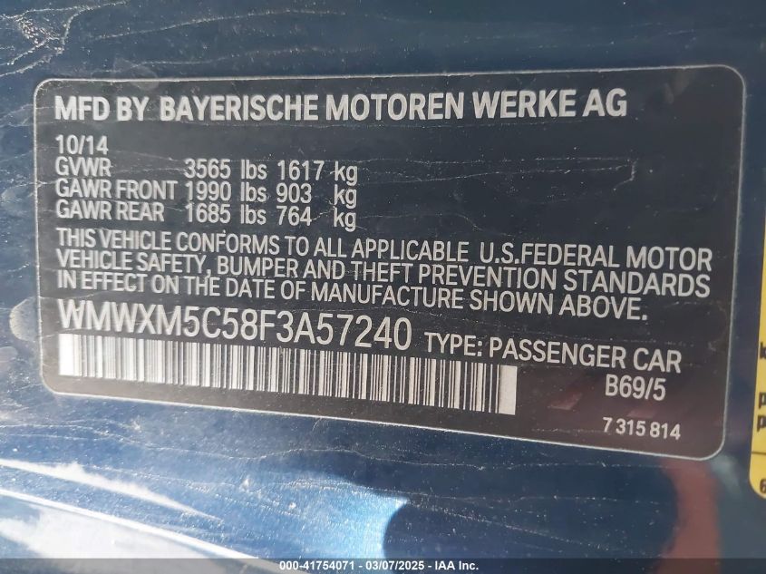 Color BlueCylinders 3Drive Front wheel driveVIN WMWXM5C58F3******State Run & Drive VerifiedDamage Front or backAuction date 2025-03-20