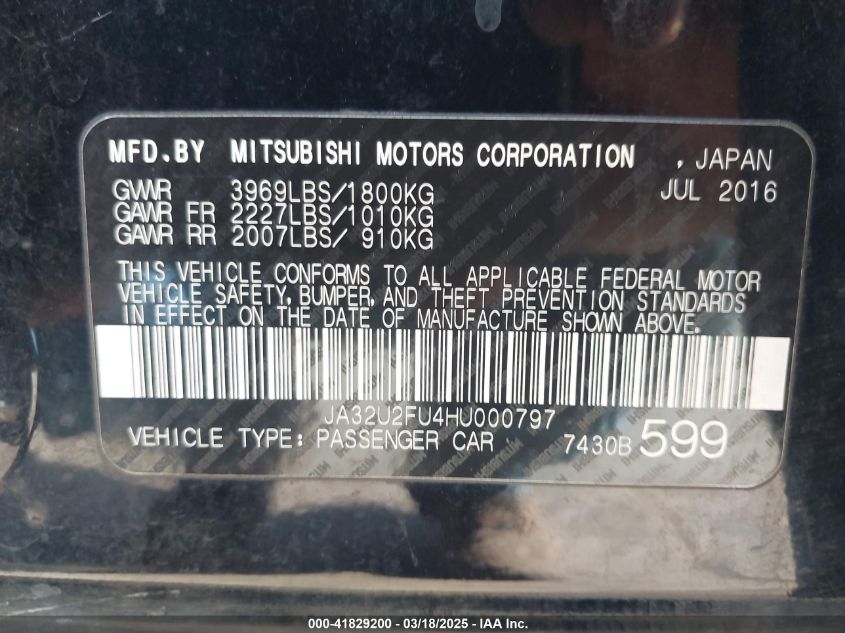 2017 MITSUBISHI LANCER 2017 Gasoline, 2.0, Front wheel drive, VIN - JA32U2FU4HU****** from the USA