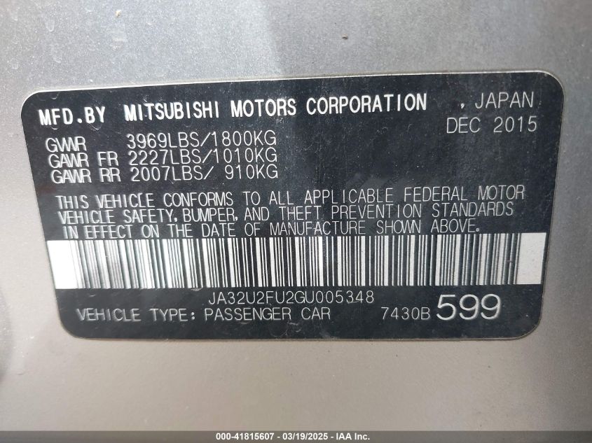 2016 MITSUBISHI LANCER 2016 Gasoline, 2.0, Front wheel drive, VIN - JA32U2FU2GU****** from the USA