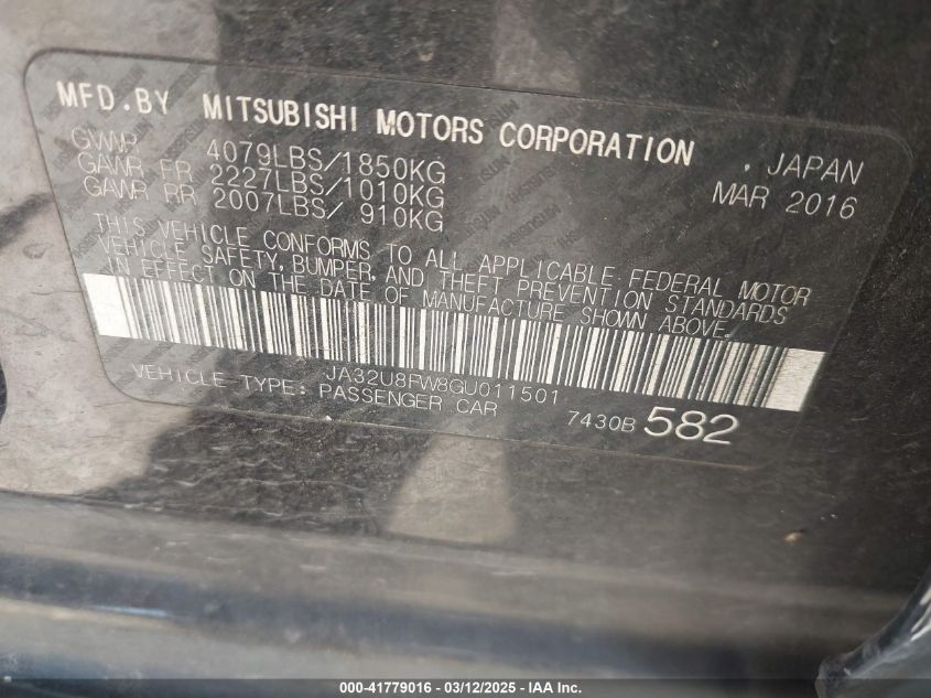 2016 MITSUBISHI LANCER 2016 Gasoline, 2.4, Front wheel drive, VIN - JA32U8FW8GU****** from the USA
