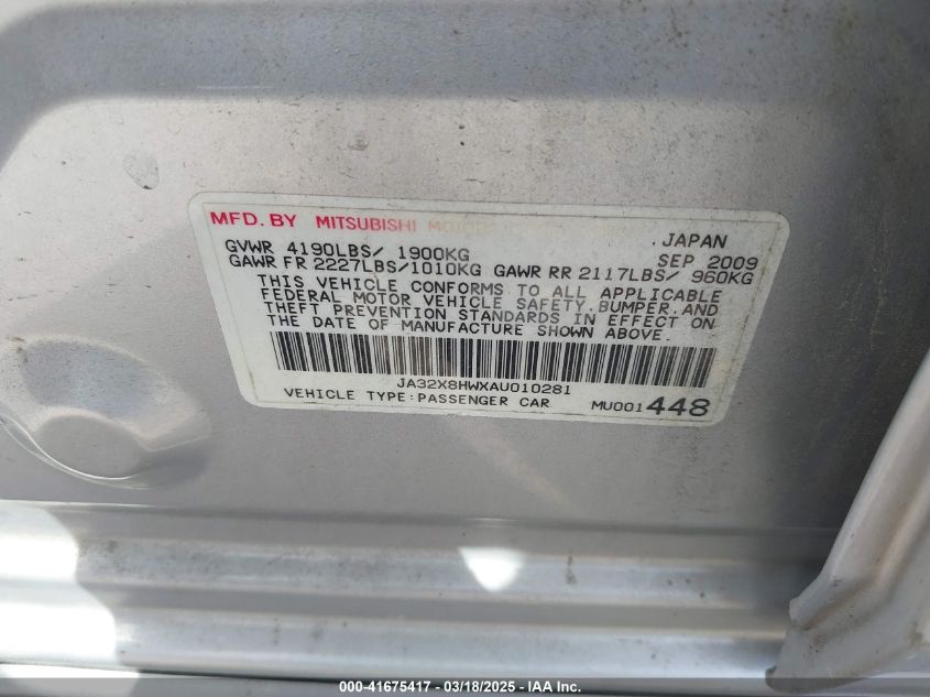 2010 MITSUBISHI LANCER SPORTBACK 2010 Gasoline, 2.4, Front wheel drive, VIN - JA32X8HWXAU****** from the USA
