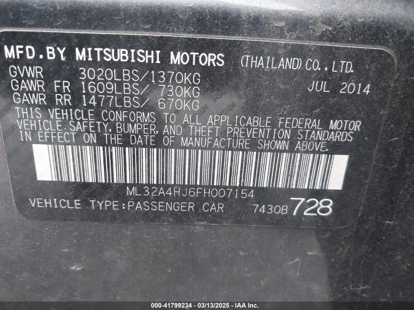 2015 MITSUBISHI MIRAGE 2015 Gasoline, 1.2, Front wheel drive, VIN - ML32A4HJ6FH****** from the USA
