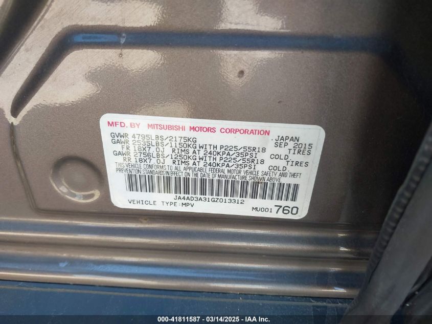 2016 MITSUBISHI OUTLANDER 2016 Gasoline, 2.4, Front wheel drive, VIN - JA4AD3A31GZ****** from the USA