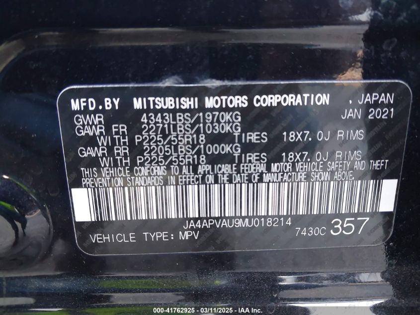 Color BlackCylinders 4Drive Front wheel driveVIN JA4APVAU9MU******State Run & Drive VerifiedDamage Front or back AutoRIA