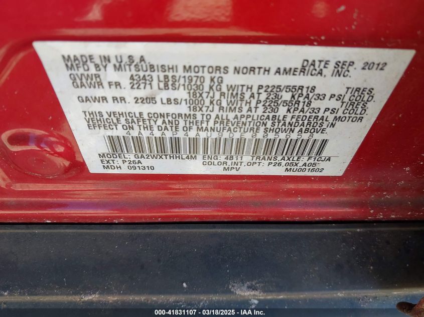 Color RedCylinders 4Drive Front wheel driveVIN 4A4AP4AU9DE******State Run & Drive VerifiedDamage MotorAuction date 2025-03-26 AutoRIA