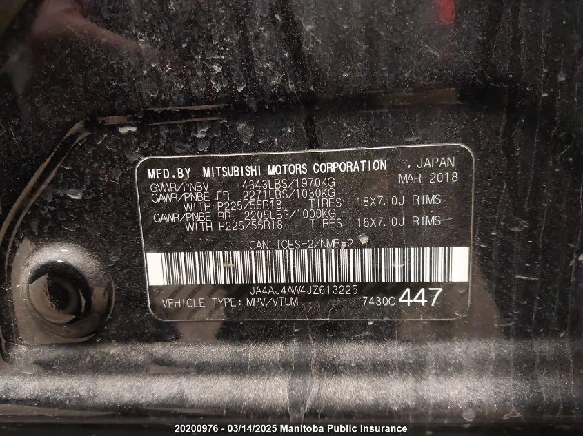 Color BlackCylinders 4Drive UnknownVIN JA4AJ4AW4JZ******State Run & Drive VerifiedDamage FrontAuction date 2025-03-26