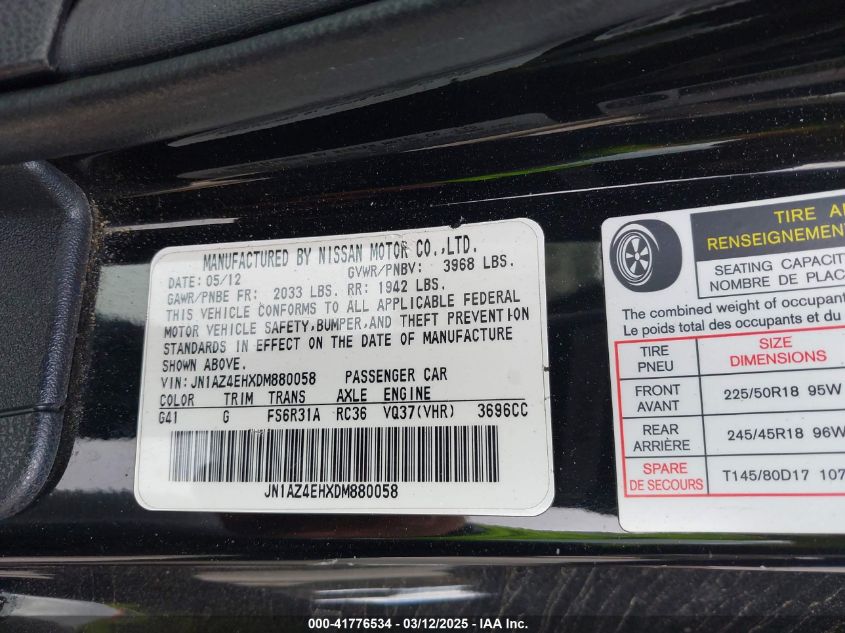 Color BlackCylinders 6Drive Rear wheel driveVIN JN1AZ4EHXDM******State Run & Drive VerifiedDamage Vandalism