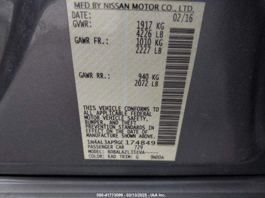Color GrayCylinders 4Drive Front wheel driveVIN 1N4AL3AP9GC******State Run & Drive VerifiedDamage Front or back AutoRIA