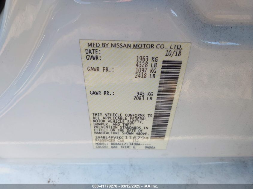 Color WhiteCylinders 4Drive Front wheel driveVIN 1N4BL4FV3KC******State Run & Drive VerifiedDamage Back AutoRIA